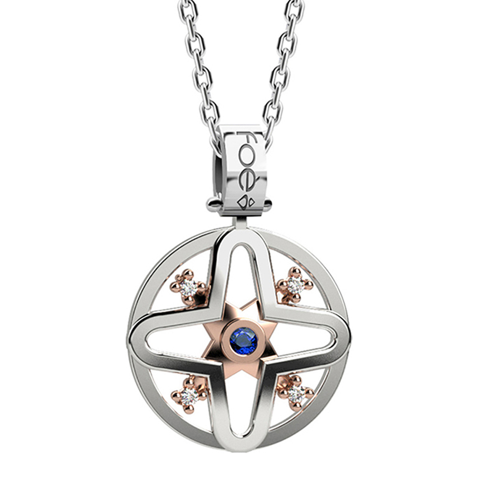 Rosa dei venti Foèuomo in oro bianco e rosa 750% con diamanti bianchi ct 0.025ca Colore G Purezza Vs e zaffiri ct 0.02caCatena in oro bianco 750% Gr 2.20Questo prodotto verrà spedito e corredato da astuccio, garanzia e shopper originali FoèuomoReferenza PU659